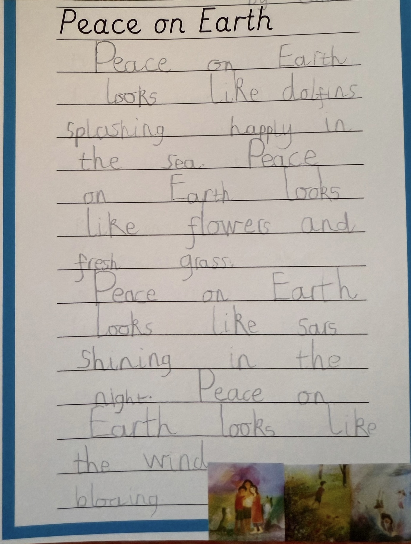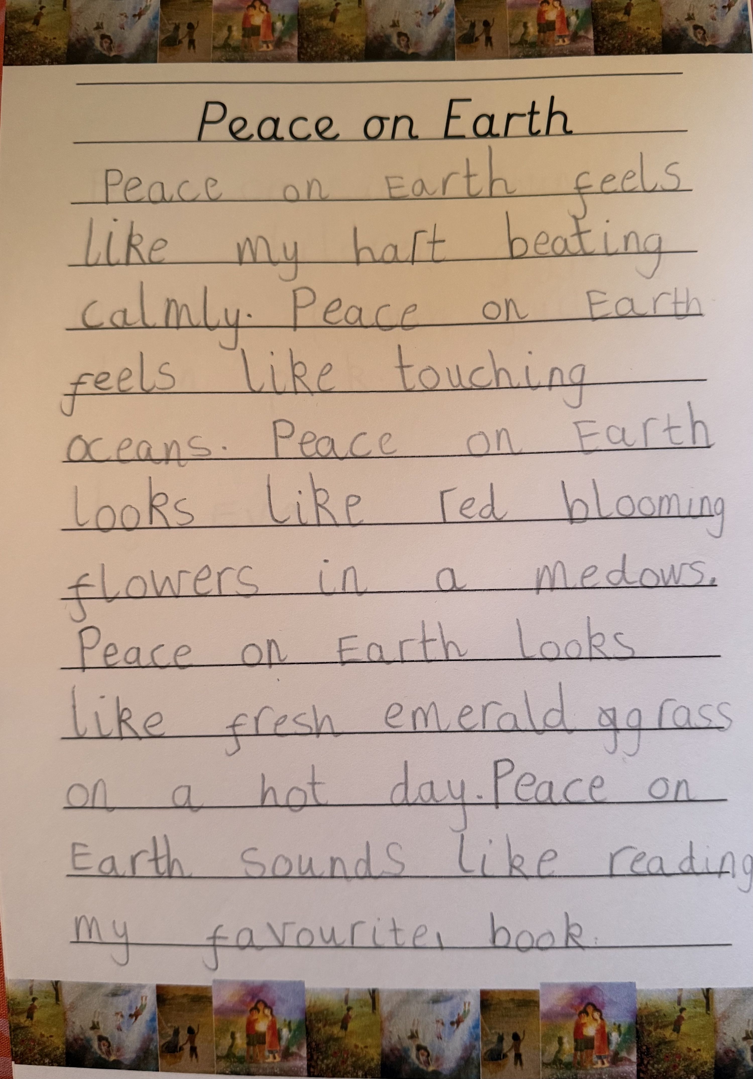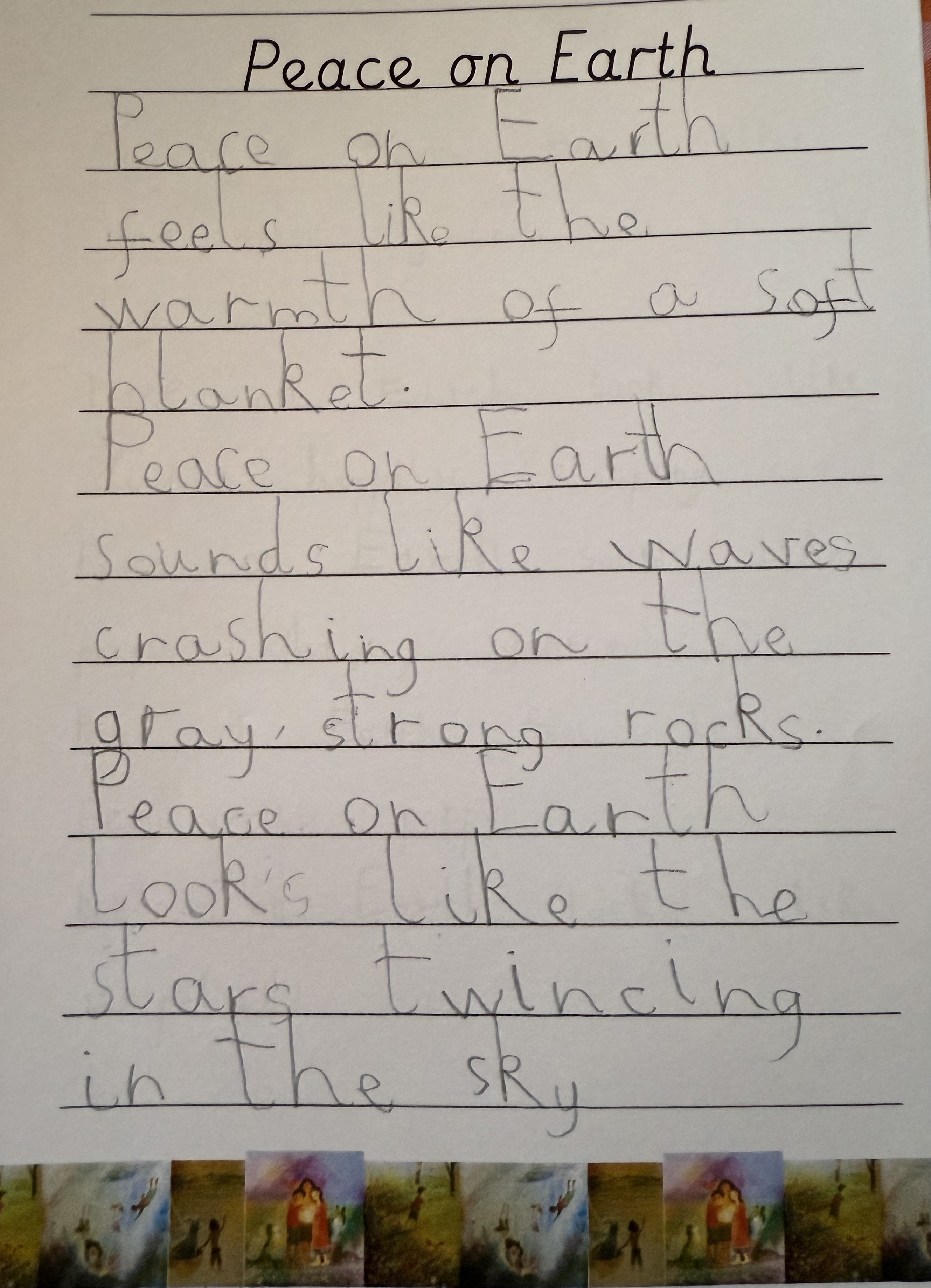 As a class, we explored what peace on earth would look, feel and sound like. The children created some beautiful writing, which they later published and is proudly displayed in our room.